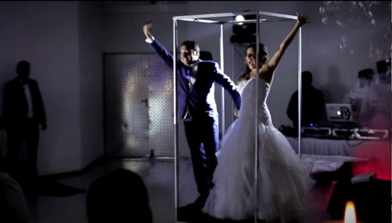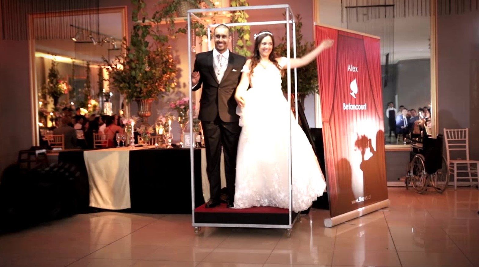 Hemos desarrollado una entrada que lo tiene todo. Intriga, espectacularidad, humor e ilusión. Los novios aparecen desde una cabina vacia que esta previamente a al vista de todos los invitados al más puro estilo "Las Vegas". Durante la presentación se hace una video llamada con el novio o la novia en la que sucede una situación muy entretenida. Posteriormente el novio pide al artista que los teletransporte al salón de eventos. Junto con una música motivante y efectos de luces, los novios aparecen frente a sus invitados.