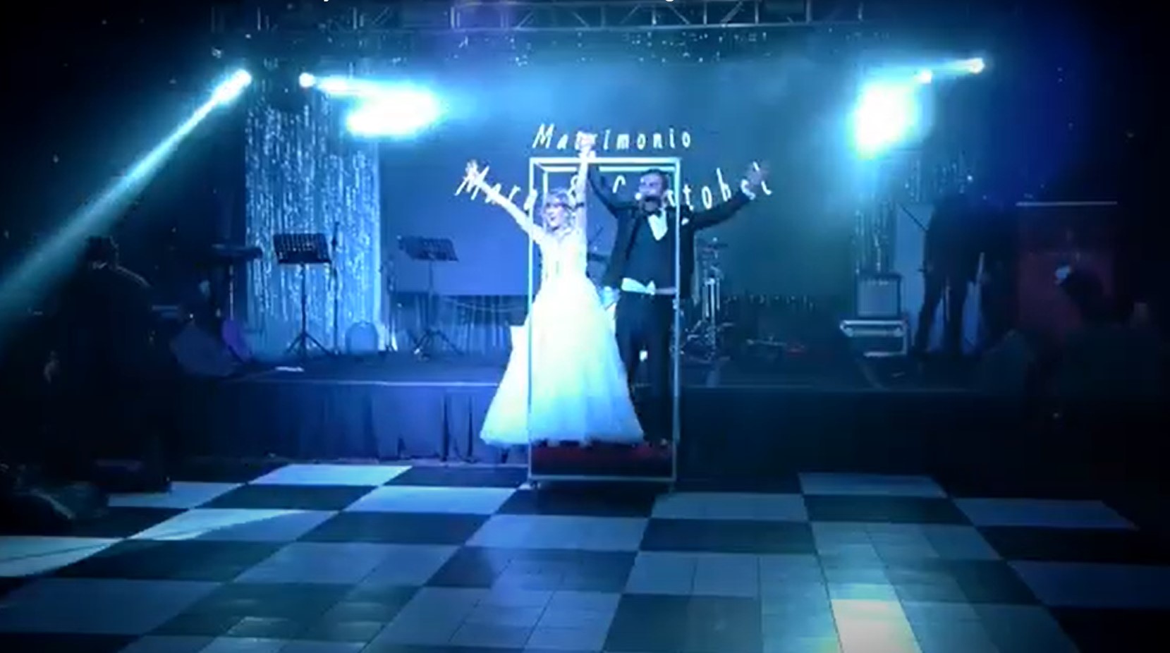 Hemos desarrollado una entrada que lo tiene todo. Intriga, espectacularidad, humor e ilusión. Los novios aparecen desde una cabina vacia que esta previamente a al vista de todos los invitados al más puro estilo "Las Vegas". Durante la presentación se hace una video llamada con el novio o la novia en la que sucede una situación muy entretenida. Posteriormente el novio pide al artista que los teletransporte al salón de eventos. Junto con una música motivante y efectos de luces, los novios aparecen frente a sus invitados.